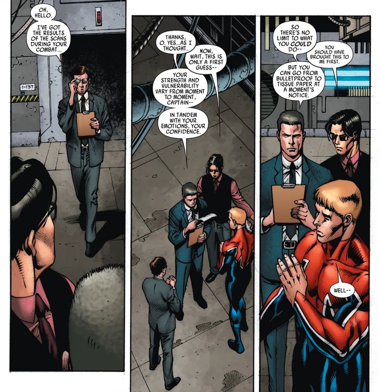 En Capitán Gran Bretaña y M13 #5 por Paul Cornell, Pat Olliffe y Paul Neary, Braddock es nuevamente salvado de la muerte por Merlín, quien usa ingeniería mágica de primer nivel para vincular los poderes de Brian a algo más intrínseco. Mientras sus compañeros de equipo en la agencia de inteligencia británica M-13 (cuya llegada se presagia en la MCU) intentan reevaluar sus niveles de poder después de la resurrección, descubren que están en un estado de cambio constante. Después de una pelea simulada, se le dice al Capitán Gran Bretaña que “puede pasar de a prueba de balas a papel de seda” en cualquier momento y que estos cambios son una respuesta directa a sus emociones y confianza.