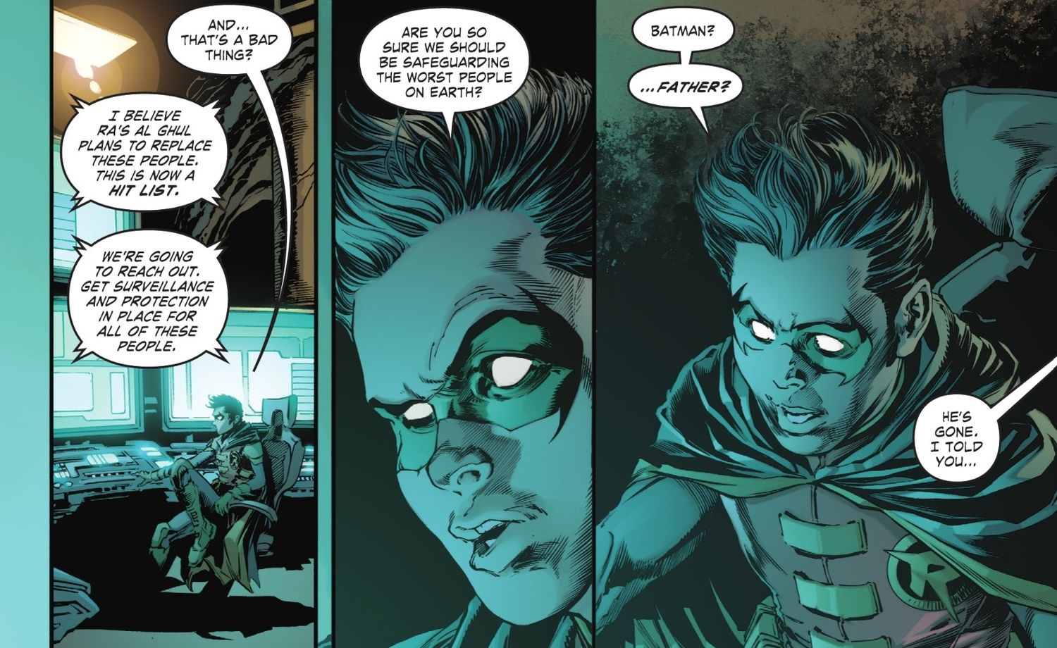 Sin embargo, el hijo de Bruce, Damian, parece estar en desacuerdo con su padre sobre el tema de matar, o al menos salvar a aquellos que no lo merecen. En Batman: Un mal día – Ra’s al Ghul #1, el viejo enemigo de Bruce y el abuelo de Damian está de vuelta con un nuevo plan para salvar el mundo. Está matando en secreto a directores ejecutivos y líderes de corporaciones que dañan activamente al mundo y los reemplaza con figuras alineadas con las creencias de Ra’s. Batman descubre el plan y pretende detenerlo. Sin embargo, Bruce le informa a Damian lo que está pasando, lo que lleva a Robin a sugerir que lo que Ra’s está haciendo en realidad no es algo malo. Incluso le pregunta a su padre si es su trabajo priorizar mantener a las personas que dañan la Tierra a salvo de las amenazas.