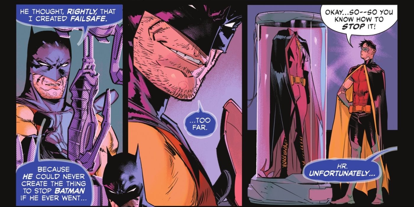 Los problemas de Batman con su personaje alternativo comenzaron cuando su contingencia robótica Failsafe se activó después de que, sin darse cuenta, creyera que Bruce cruzó una línea y mató al Pingüino (que simplemente fingió su muerte). Failsafe fue ideado por Batman de Zur-En-Arrh, por lo que cuando el androide comenzó a atacar, Batman permitió que Zur-En-Arrh tomara el control del cuerpo de Bruce para intentar derribar la amenaza mecanizada. Desafortunadamente, Failsafe demostró ser demasiado resistente y El enfrentamiento de Batman con la contingencia terminó con Bruce siendo enviado a una dimensión alternativa..