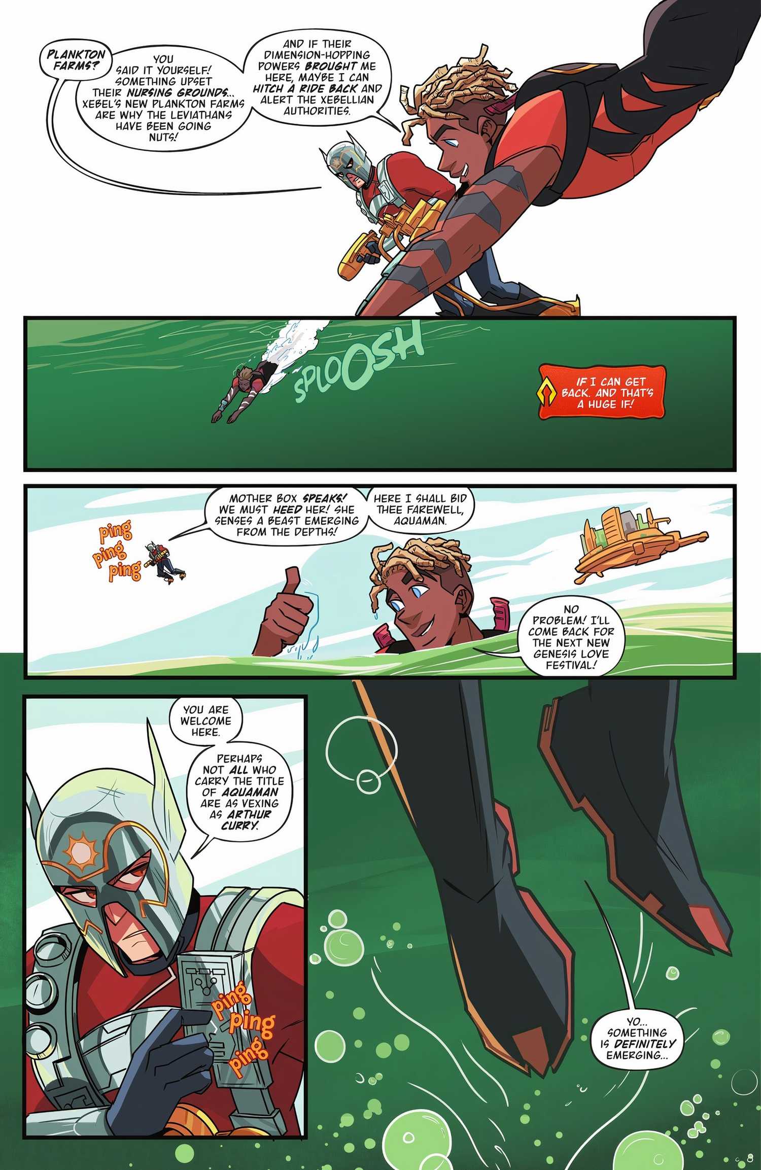 Escrito y dibujado por Ngozi Ukazu y parte de Orgullo DC 2024, “Los ríos y los lagos a los que estás acostumbrado” comienza con Aquaman y Ha’Wea teniendo una conversación sincera, cuando de repente un Leviatán gigante los interrumpe. El Leviatán, asustado por las granjas de plancton de Xebelian, usa sus poderes de deformación dimensional para enviar a Aquaman a Nuevo Génesis.