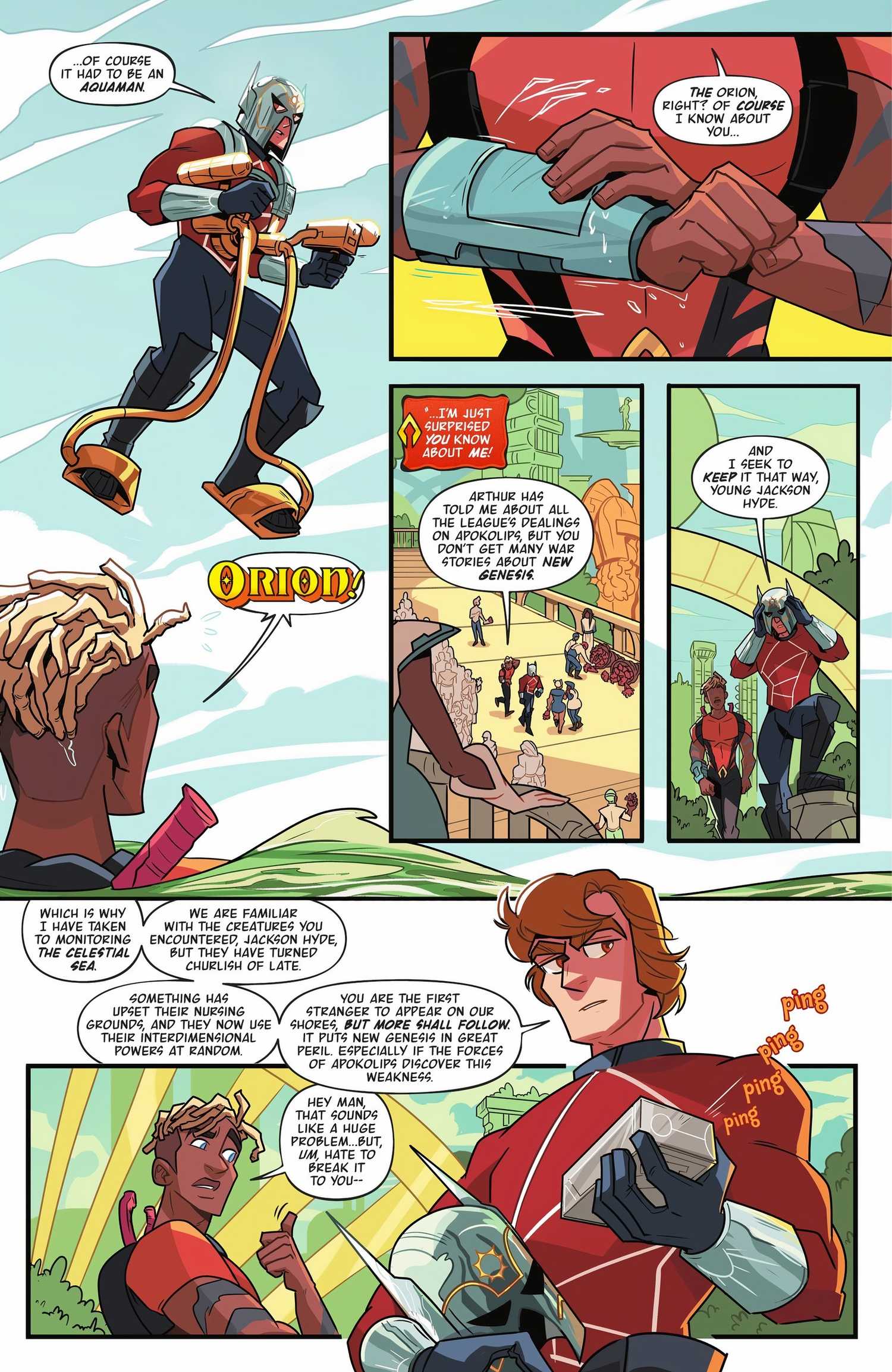 Aquaman Jackson Hyde y Orion son los dos últimos héroes de DC que los fanáticos esperan ver formar equipo. Jackson Hyde, hijo de Black Manta, es un ex Aqualad que recientemente asumió el manto de Aquaman. Orion es el hijo de Darkseid, enviado a vivir en New Genesis como parte de un acuerdo de paz con Apokolips. Orión, ex miembro de la Liga de la Justicia, es un guerrero feroz que lidera la lucha contra su padre, mientras que Aquaman generalmente permanece en la Tierra. Estos dos aparentemente no tienen nada en común, pero al final de la historia, son amigos.