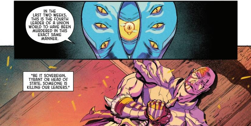 Los científicos de Sakaar decidieron buscar tales venenos sin conocer la naturaleza de los venenos porque Hiro-Kala es el cuarto líder político dentro del Consejo Galáctico para perecer misteriosamente, todo de manera similar. El momento es particularmente sospechoso, sabiendo que todo esto está sucediendo en la víspera de las negociaciones del Consejo Galáctico sobre la soberanía, los tratados y las leyes que gobernarán la galaxia. Los cuerpos continúan acumulándose, mientras un francotirador misterioso incita a múltiples bajas durante la reunión, incluido el de J’son, padre de Star-Lord y el reemplazo de Victoria en el trono.