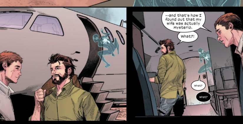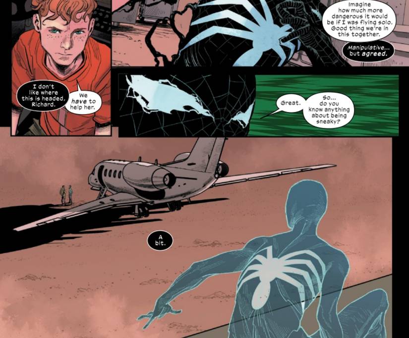 En Ultimate Spider-Man #18 – Por Jonathan Hickman, Marco Checchetto, Erick Arciniega y Cory Petit – Peter y su familia se encuentran con el heroico Harry Osborn. Mientras Peter y Harry se reúnen, Richard habla con la IA de su traje, tratando de encontrar una manera de visitar a su novia, el nuevo gato negro. Richard habla de la demanda (cuya IA se basa en la personalidad de su padre) para ayudarlo, preguntando, “¿Sabes algo sobre ser astuto?” La demanda responde afirmativas, Turning de Richard Parker’s Spider-Man Invisible.