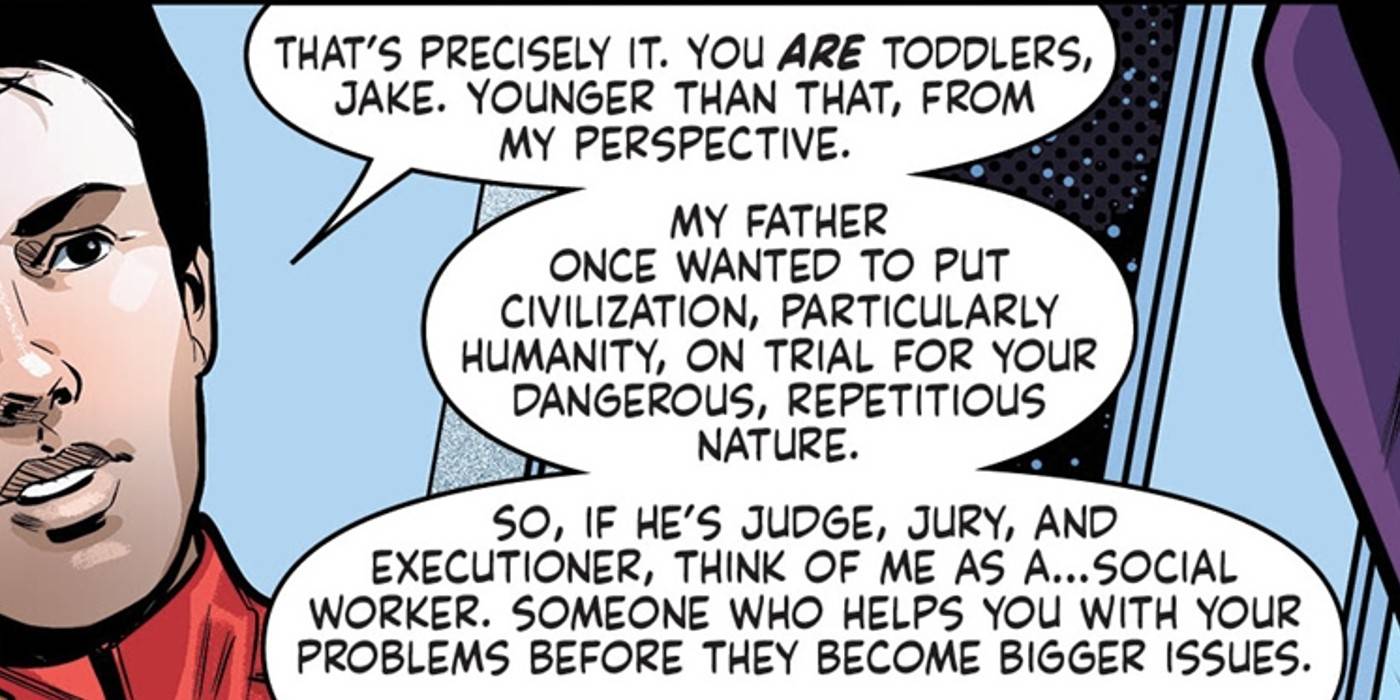 Hijos de Star Trek #2 está escrito por Morgan Hampton y dibujado por Angel Hernandez. Alexander se ha frustrado con Q Jr. Jake y Nog, también hartos de las maquinaciones de Q Jr, le preguntan por qué lo está haciendo. Anteriormente, Q Jr sólo había dicho que estaba tratando de ayudarlos. Cuando se le presiona, Q Jr explica que su padre había juzgado a la humanidad por su naturaleza salvaje y violenta. Q Jr compara a su padre con “juez, jurado y verdugo”.