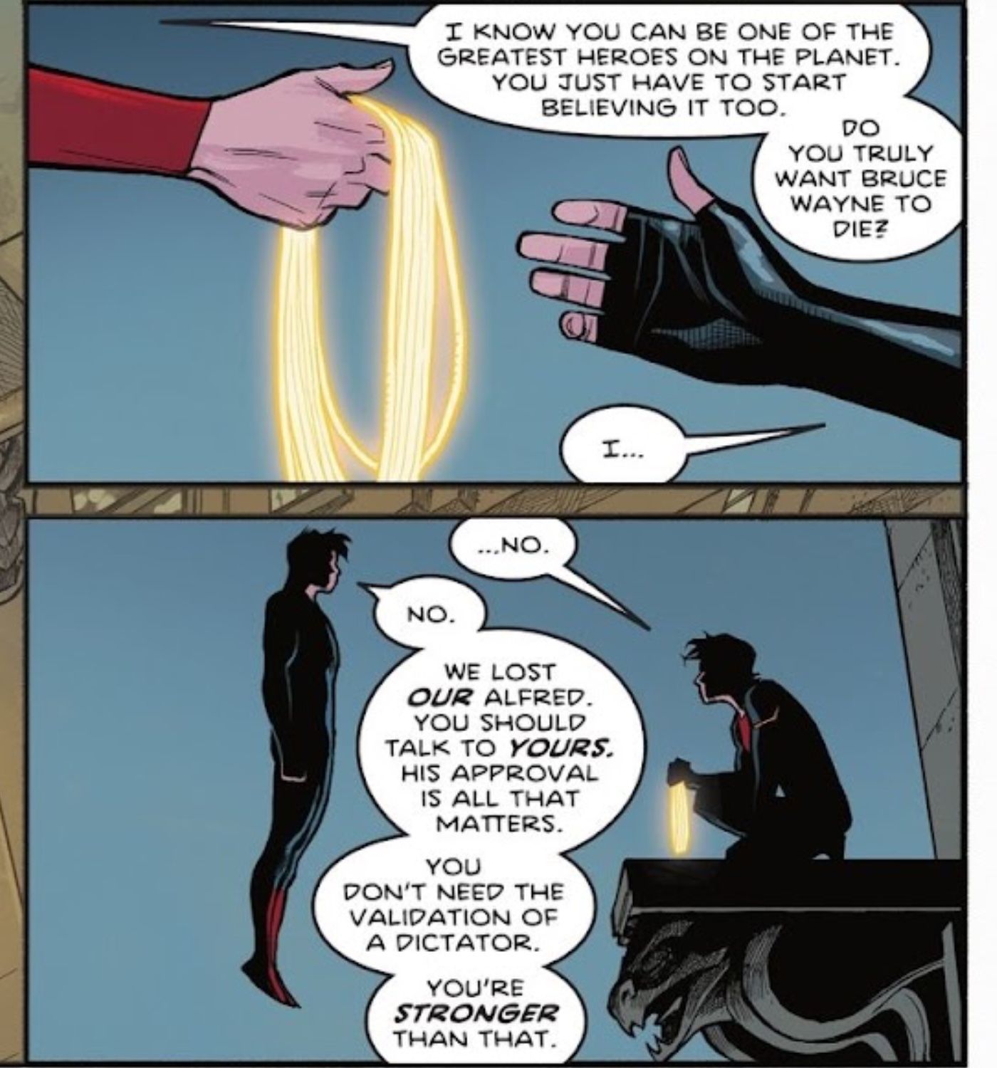 Las aventuras de Superman: Jon Kent # 6 de Tom Taylor, Clayton Henry, Jordie Bellaire y Wes Abbott encuentra a Jon confrontando las fuerzas del Superman fascista de este universo una por una, incluida la Mujer Maravilla de este mundo. Tomando el Lazo de la Verdad de Diana, el joven Superman se encuentra con el Robin de este mundo y le dice a su viejo amigo “Sé que puedes ser uno de los héroes más grandes del planeta. Solo tienes que empezar a creerlo tú también.Luego, Jon le pregunta a Damian si realmente quiere que su padre, Batman, muera. Aferrándose al Lazo, Damian admite que no lo hace, un giro sorprendente para un Robin aparentemente despiadado, y que podría estar insinuando un camino más brillante por delante para una de las variantes más oscuras de Damian.