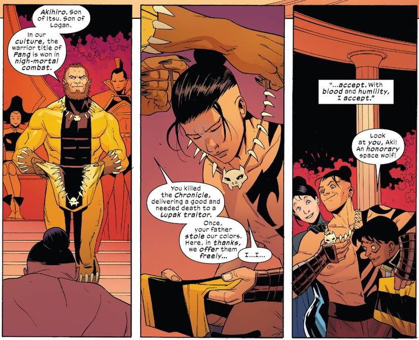 HellverinaEl diseño de ‘s para la forma de fuego infernal de Akihiro puede ser nuevo, pero El traje que lleva Akihiro tiene su propia historia.El disfraz de Fang le fue entregado a Akihiro en 2022. Merodeadores #5 (De Steve Orlando y Andrea Broccardo.) Es un uniforme tradicional que usan los campeones de la sociedad alienígena Lupak, y sus miembros más famosos ganan posiciones en la Guardia Imperial Shi’ar. Recibir el traje y el nombre en clave/título Fang que lo acompaña fue un momento importante que vio a Akihiro salir de la sombra de Wolverine y abrazar su propia identidad como héroe.