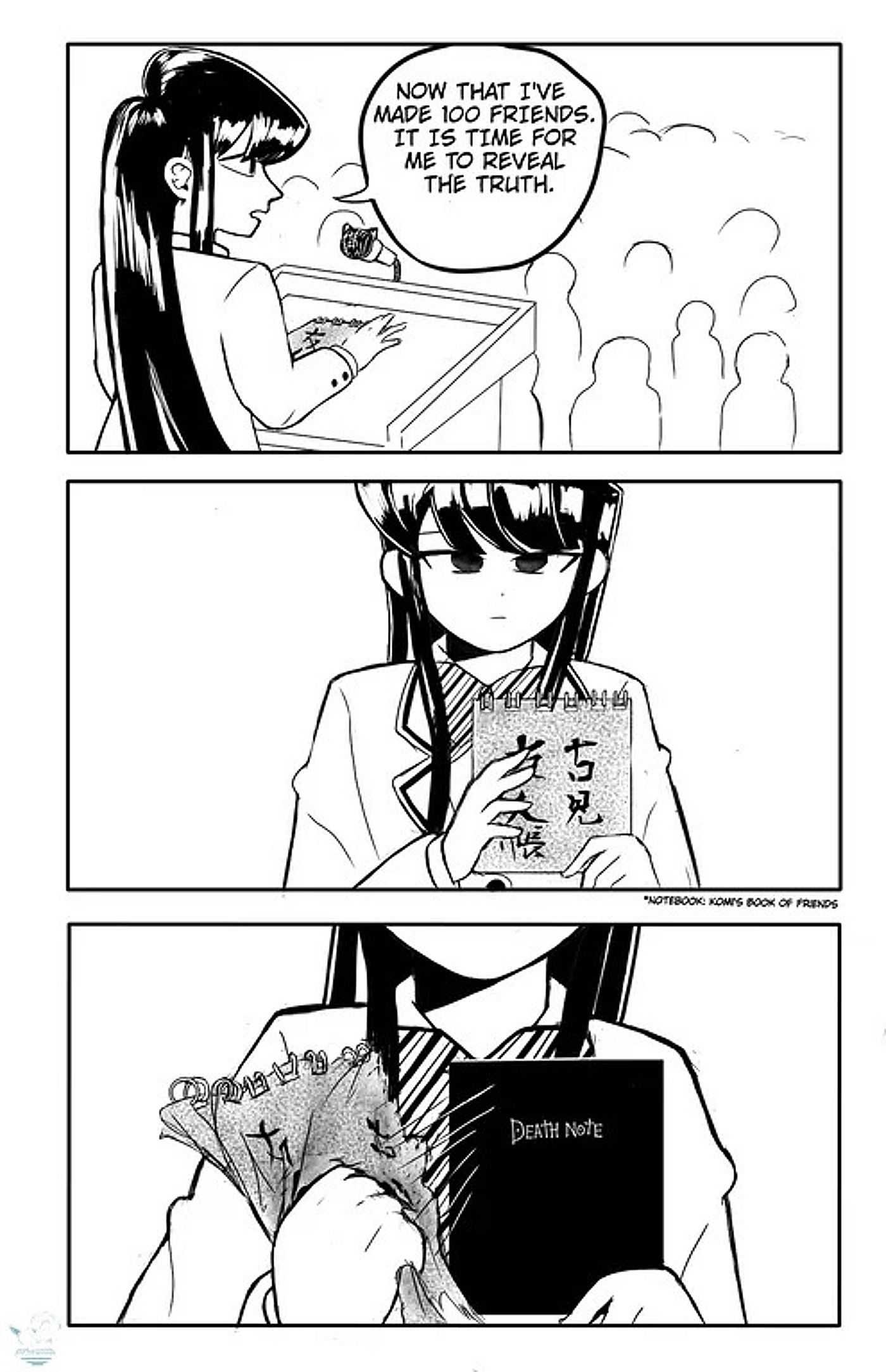 El artista Turbulent_Set8884 compartió recientemente una obra de arte de un fan en la página de la comunidad Komi-San Reddit que imagina el final de Komi no puede comunicarse. Komi se dirige a sus 100 nuevos amigos con valentía en su voz. Sin embargo, resulta que ella ha estado guardando un secreto. Saca su cuaderno que ha estado usando para enumerar a cada uno de los amigos que hizo con la ayuda de Tadano durante la escuela secundaria y revela que la portada es falsa. La verdad es que ha estado escribiendo los nombres de todos nada menos que en Death Note en un giro hilarante de los acontecimientos que es digno de estar al mismo nivel que los momentos más divertidos de la serie.