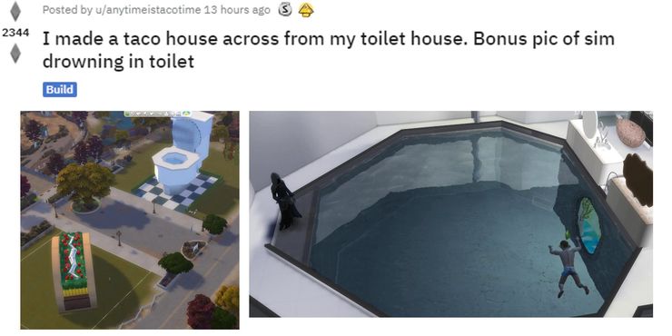 Un jugador astuto continúa con esta larga tradición de Sims 4 tortura, aunque con un toque cómico y absurdo. Fiel a su nombre, el usuario de Reddit anytimeistacotime recientemente compartió en línea algunas imágenes de su casa con tema de tacos. Mientras que este edificio. tiene la forma de un taco gigante, es impresionante, la verdadera atracción está al otro lado de la calle, donde reside un enorme edificio con forma de baño, esperando para atraer a los Sims. Esta trampa parece ser efectiva, ya que una de las imágenes compartidas de anytimeistacotime es de un ahogado Sim flotando en la colosal taza del inodoro, con Grim Reaper de pie pacientemente junto al agua.