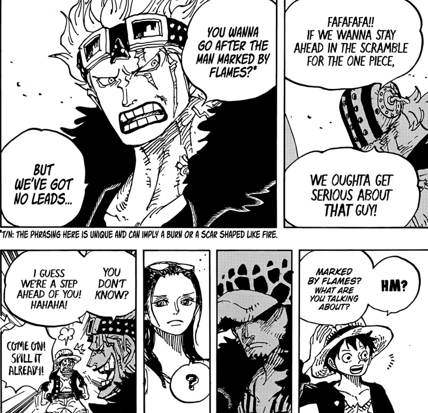 Después de la derrota de Kaido y Big Mom al final de de una pieza En el arco de Wano, los tres capitanes que lograron este objetivo imposible se reunieron para discutir sus próximos pasos, incluida la ubicación del último Road Poneglyph necesario para encontrar la isla oculta de Laugh Tale. En el capítulo #1056, Eustass Kid menciona que cierto “hombre marcado por las llamas”, también traducible como “El hombre con una cicatriz de quemadura” sabe sobre el Poneglifo, pero se negó a decir más sobre él.