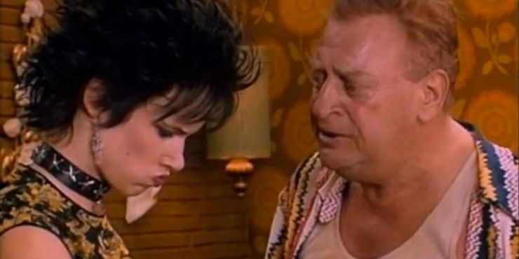 en lo que es sorprendente uno de los mejores papeles de Dangerfield, ofrece una actuación satírica e inquietante como el padre abusivo de Mallory. Su escena introductoria se filma como una comedia de situación, y al principio, Dangerfield parece ser su típica caricatura tonta hasta que su verdadero y horrible lado oscuro se revela muy rápidamente. Después Asesinos natospocos podrán volver a mirar a Rodney Dangerfield de la misma manera.