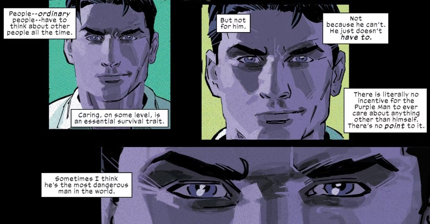 Al igual que la versión MCU de Killgrave, que tuvo un impacto cultural masivo en Jéssica Jones, el Hombre Púrpura tiene el poder de mando total y absoluto. Con una sola palabra, puede obligar a cualquiera a hacer lo que quiera. Si le dijera a alguien que cayera muerto, probablemente lo haría literalmente. Este poder le permite evitar por completo la necesidad de manipularlos. Al Hombre Púrpura no necesita importarle lo que la gente quiere o cuáles son sus motivaciones o creencias. Es completamente irrelevante para él porque, con una sola orden, puede ordenarles que hagan lo que quieran. Esto permite que el Hombre Púrpura sea un verdadero sociópata. quien literalmente no tiene motivos para preocuparse por la vida de las personas que lo rodean.