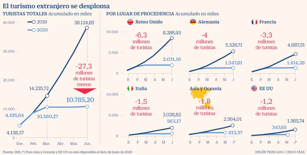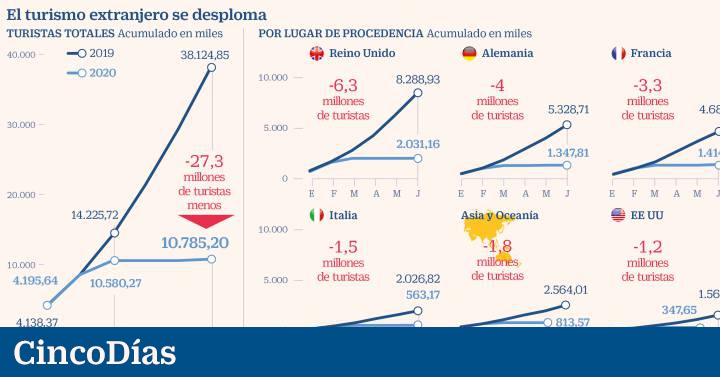 No está siendo así o, al menos, no lo está siendo al ritmo que precisan los hoteles de lujo, donde el 65% de los huéspedes son extranjeros, según el último informe del banco BNP Paribas. Los últimos datos del Instituto Nacional de Estadística hablan de una pérdida acumulada para el año 2020 de más de 27 millones de turistas extranjeros hasta junio, último mes disponible. Los informes del mes de julio, que van llegando a cuentagotas desde las asociaciones de hosteleros, no son mucho mejores.