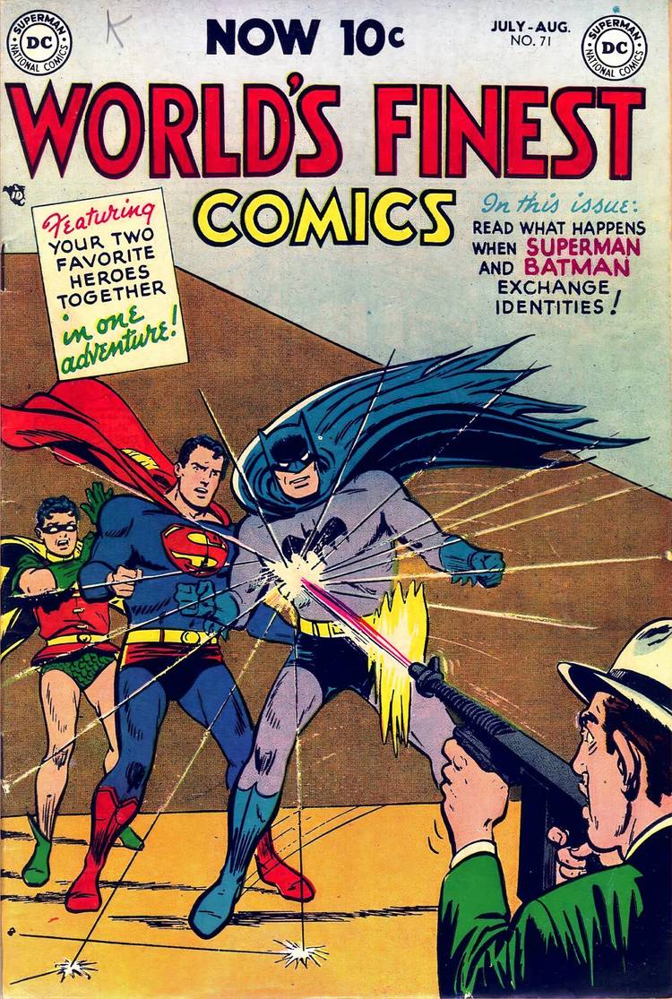 Batman y Superman terminaron emparejados porque eran los personajes más populares de DC/National en ese momento.con Los mejores cómics del mundo presentando a ambos personajes en historias separadas. Mientras Lo mejor del mundo Inicialmente tenía 96 páginas, los recortes de publicación en la década de 1950 vieron una reducción del número de páginas, disminuyendo la cantidad de historias incluidas por número. Eso finalmente llevó a que Superman y Batman coprotagonizaran la misma historia, comenzando con su primer equipo en Los mejores cómics del mundo #71 en 1954. Durante décadas, habían existido en paralelo, y sólo fueron preocupaciones prácticas del mundo real las que los unieron.
