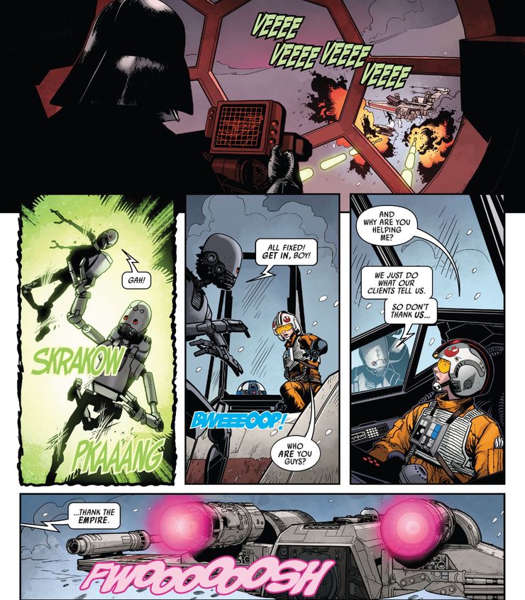 En el nuevo número, Vader estaba persiguiendo el X-Wing de Luke en su TIE Advanced, dando un golpe directo que obligó a Luke a estrellarse en la superficie del planeta. Si bien el hijo de Vader ciertamente estaba en problemas, el Señor Oscuro fue sorprendentemente atacado por la Pandilla Pirata Droid Crush (a quien Vader se había enfrentado antes), trabajando para la propia Moore, quien decidió hacer su movimiento y traicionar al Señor Oscuro. Además, mientras algunos de los piratas droides se pusieron a trabajar distrayendo a Vader, otros aterrizaron en el X-Wing derribado de Luke para reparar sus sistemas (para su sorpresa). No solo eso, sino que también le dijeron que agradeciera al Imperio por su ayuda para salvarle la vida.