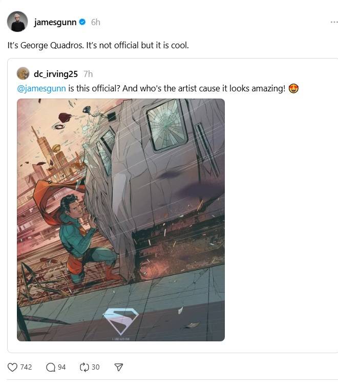 Dado que ni Gunn, Warner Bros. Discovery ni las cuentas oficiales de redes sociales de DC compartieron el Superhombre póstermuchos fanáticos comenzaron a preguntarle al director si esto realmente era oficialmente parte del marketing de la película. Gunn no tardó mucho en aclarar que el Superhombre El cartel no es oficial y dice: “Es George Quadros. No es oficial pero es genial”.