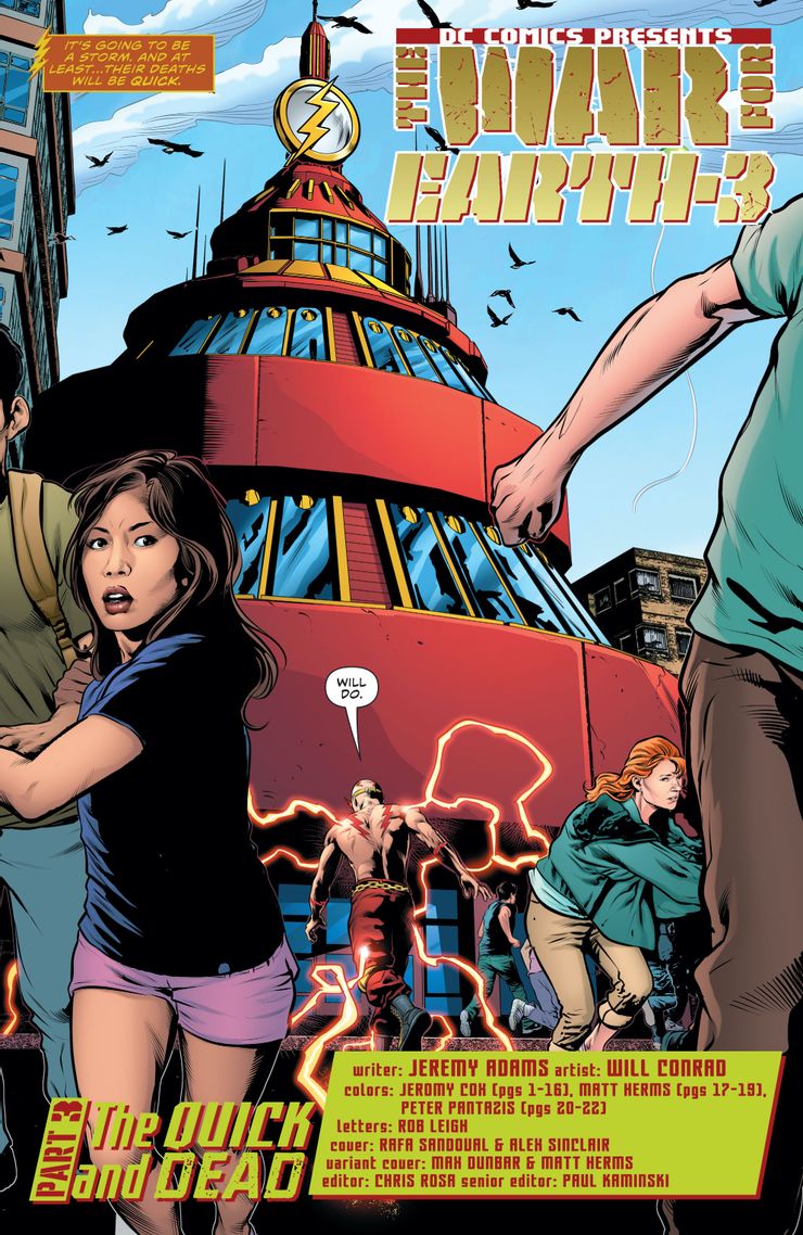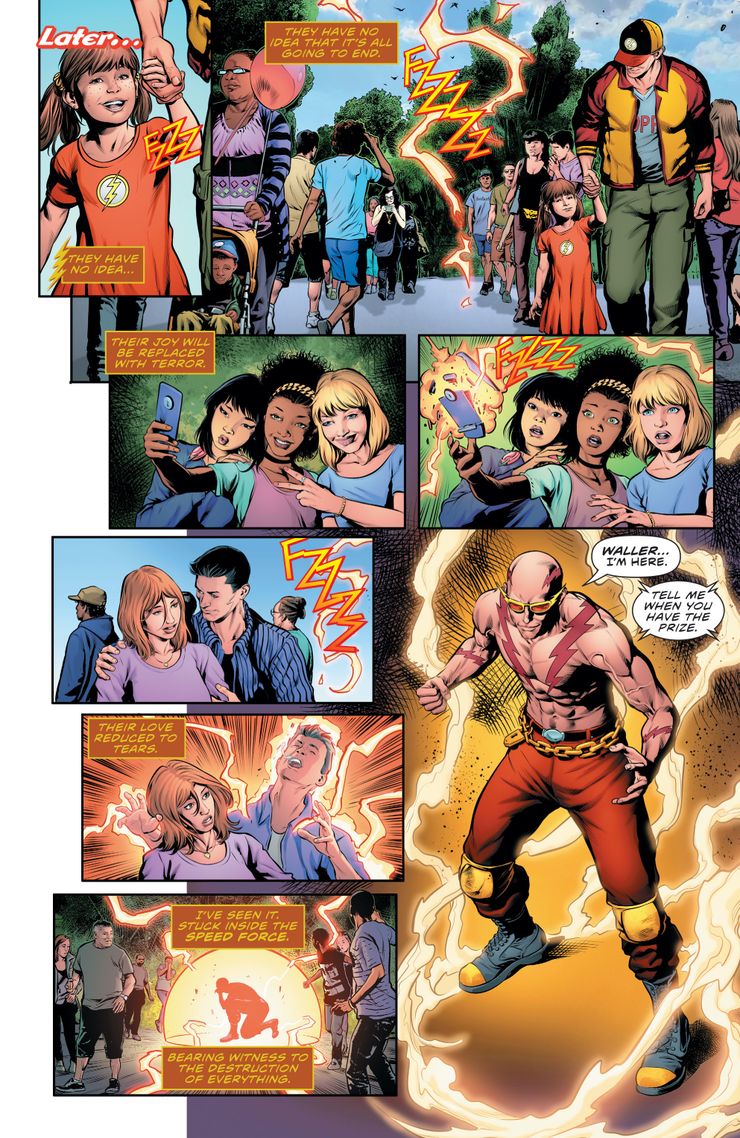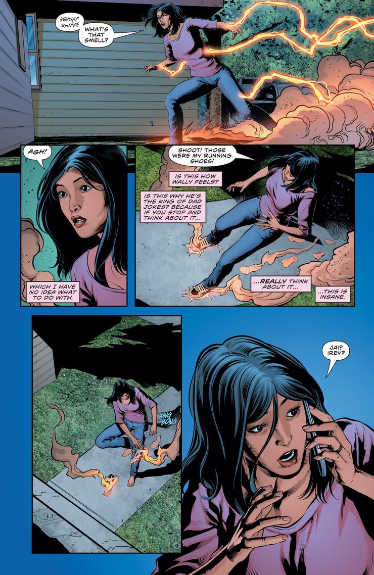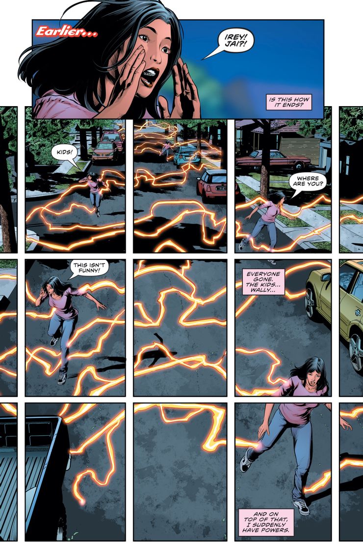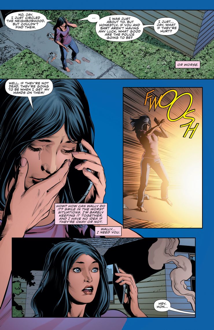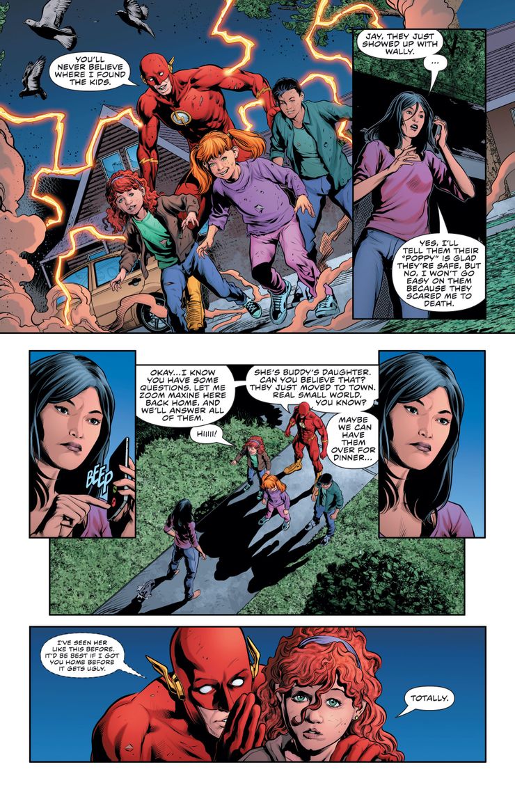 La vista previa comienza con Johnny Quick, el presunto velocista muerto de Earth-3, que llega a nuestra Tierra en busca de pelea. Luego, en una secuencia de flashback, Linda, la esposa de Wally, está usando sus propios poderes de velocidad recién descubiertos para recorrer el vecindario, buscándola a ella y a los niños desaparecidos de Wally. Wally regresa, no solo con sus propios hijos, sino también con Maxine Baker, la hija de Animal Man. Maxine, de quien se insinúa que es más poderosa que su padre, usó sus poderes para ayudar a Flash y sus hijos a regresar a la Tierra. Wally luego le informa a Linda que Animal Man y su familia se han mudado a su ciudad, y que él y Linda deberían invitarlos a cenar.