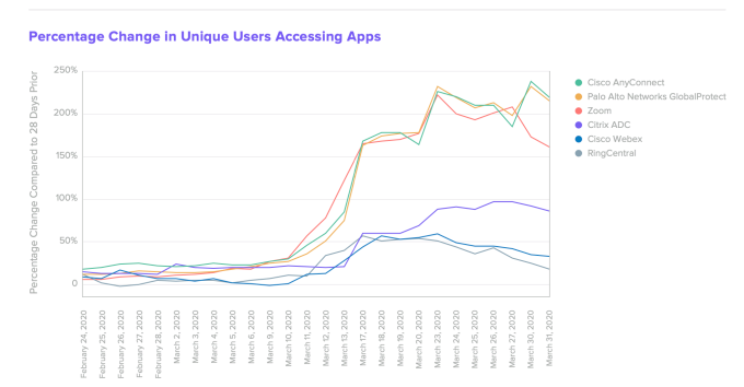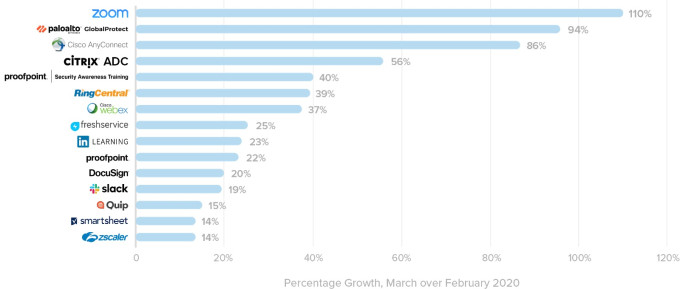 Los mayores ganadores aquí más allá de las herramientas de colaboración fueron las empresas de VPN con Palo Alto Networks GlobalProtect y Cisco AnyConnect con 94% y 86% de aumento de uso, respectivamente. Pero no fueron las únicas herramientas en crecimiento, ya que Okta informó que la herramienta de equilibrio de carga Citrix ADC y las aplicaciones de capacitación de seguridad de ProofPoint también mostraron fuertes ganancias.