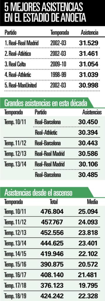 El récord lo ostenta la visita del Real Madrid en abril de 2003, con el liderato en juego. 31.529 espectadores vibraron con el 4-2 al equipo de los ‘galácticos’. El último partido de aquella temporada, con la Real conservando remotos boletos para cantar el alirón, concitó a 31.461 seguidores.