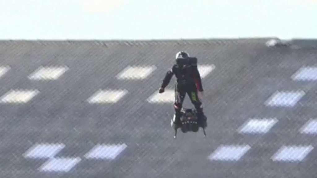 Zapata, de 40 años, asombró a la multitud parisina en el Día de la Bastilla, cuando voló por encima de los líderes europeos en su aerodeslizador.