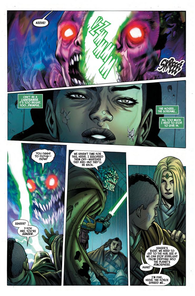 Si bien Nihil atacó recientemente el Starlight Beacon de la Alta República, la nueva vista previa de La Alta República #15 del escritor Cavan Scott y el artista Ario Anindito revela que Sskeer puede ser crucial para mantener a salvo al resto de los Jedi. Los Nihil han desatado los poderosos niveladores asesinos de Jedi en Starlight Beacon; criaturas mortales que pueden abrumar a los seres sensibles a la Fuerza, anulando su conexión con la Fuerza antes de convertirlos en piedra. Sin embargo, Sskeer se queda atrás en esta nueva vista previa, lo que permite que sus compañeros Jedi escapen mientras él les gana tiempo, su debilidad actual en la Fuerza lo ve afectado por los niveladores. Disfrute de las páginas de vista previa del número final de este actual Alta República serie: