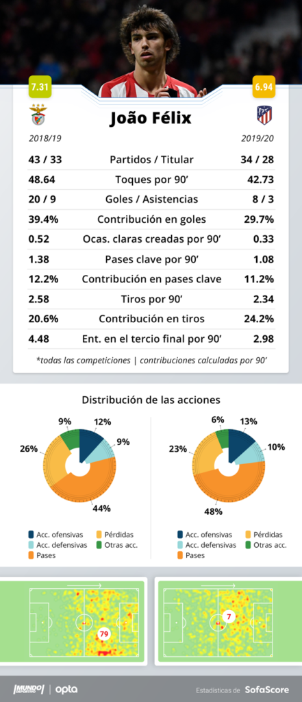 En el Benfica tenía más contacto con el balón, 48 toques de media por partido por los 43 en el Atlético. Remata más o menos lo mismo, 2,5 de media por choque en Portugal por los 2,3 en el cuadro colchonero. Más pases clave en Lisboa (1,3) que en Madrid (1,08). Y por supuesto menos participación en cuanto al total de goles, casi un 10%. En las ‘Águilas’ un 39,4% de los goles y en el club colchonero un 29,7%. Y lo sorprendente en este sentido es que Joao Félix dispara más en el Atlético de lo que lo hacía en el Benfica, casi un 4% más por partido.