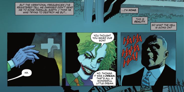De pie ante las lápidas de su familia, Thomas reflexiona sobre el hecho de que esto no es un truco, que él es de vuelta a su universo original. Y mientras piensa en ello, a los lectores se les muestra una familiar mano enguantada de color púrpura que alcanza el hombro de Thomas, un frío “Ja” que acompaña su movimiento. Saludando a los lectores con una sonrisa sádica, un personaje sorpresa que no ha aparecido en años da a conocer su presencia, ¡y no es otro que el Joker de Martha Wayne! O eso creemos. Diciendo: “¿Pensaste que salvaste a nuestro hijo? No, Tomás. Fue un sueño, eso es todo. Un pequeño sueño maravilloso”, se deja muy claro que este no es el Flashpoint Joker original que los fanáticos están viendo, sino un producto de la imaginación deshilachada de Thomas que regresa para perseguirlo donde más duele.