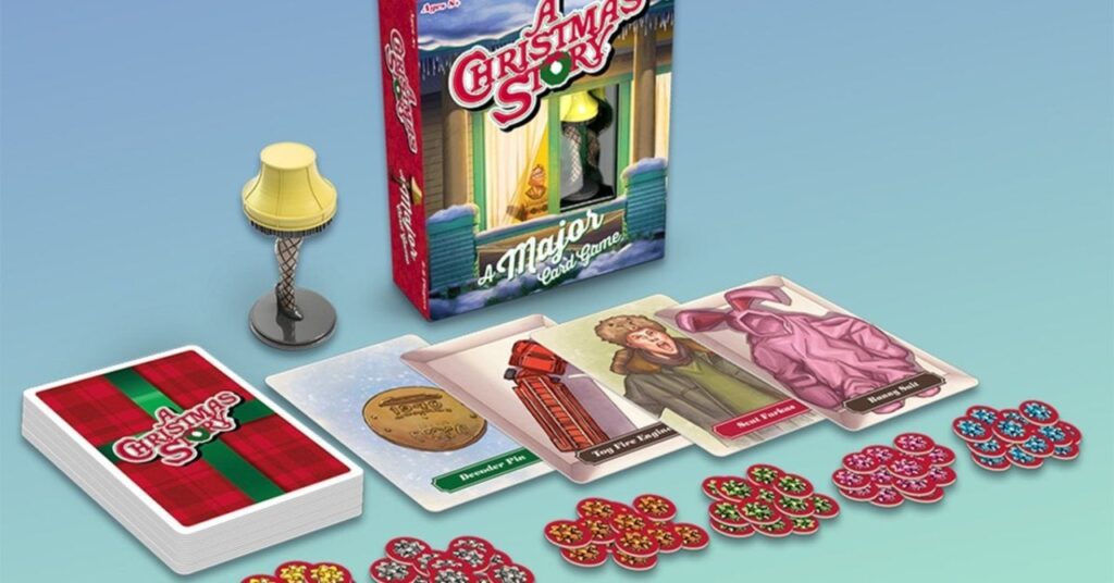 En A Christmas Story: A Major Card Game, ayudarás a Ralphie a conseguir la pistola BB y el anillo decodificador que quiere para Navidad. Puedes echar un vistazo a las cartas actuales y “desafiar a tres perros” a otros jugadores para hacer intercambios arriesgados mientras esperas alejarte de los matones que acechan en el mazo. Se incluye una lámpara de pierna en miniatura, y el jugador que tiene este importante premio puede deslizar la tarjeta de otro jugador si actúa rápidamente.