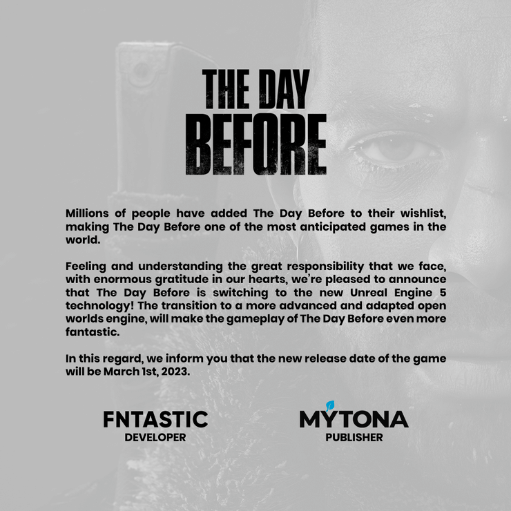 En un anuncio oficial de los desarrolladores del juego (a través de IGN), El día antes se retrasa desde el próximo mes hasta 2023, para permitir que FNTASTIC cambie el desarrollo del juego a Unreal Engine 5. La transición al motor avanzado ha retrasado la fecha de lanzamiento del 21 de junio de 2022 hasta el 1 de marzo de 2023. En su anuncio , el desarrollador afirma que el cambio a “un motor de mundos abiertos más avanzado y adaptado” alterará por completo las posibilidades de juego, haciendo que “El día antes aún más fantástico.” IGN señala que El día antes es actualmente el juego más deseado de Steam y el anuncio de retraso confirmó que “millones de personas” tienen el juego en su lista de deseos.