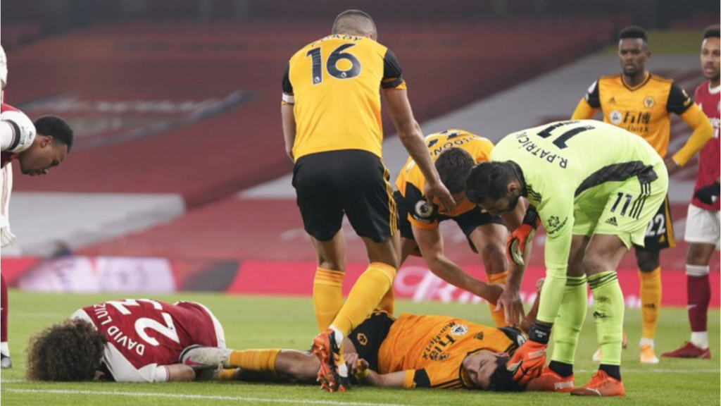 Rápidamente se pidió ayuda al personal médico en la cancha. Luiz se sentó tras un par de minutos y eventualmente lo atendieron en la banda a la izquierda de la portería de los Wolves.