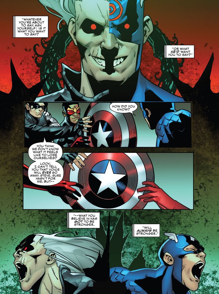 Todavía perseguido por Knull, el Capitán América está a punto de darse por vencido y dejar de empuñar el escudo hasta que el Halcón y el Soldado de Invierno lleguen para ayudarlo, alentándolo a retener el manto del Cap y seguir luchando como el héroe que siempre ha sido. Winter Soldier proporciona especialmente un estímulo muy necesario, y si alguien en el Universo Marvel sabe lo que es ser controlado y obligado a convertirse en el peón oscuro de otra persona, ese es Bucky Barnes.