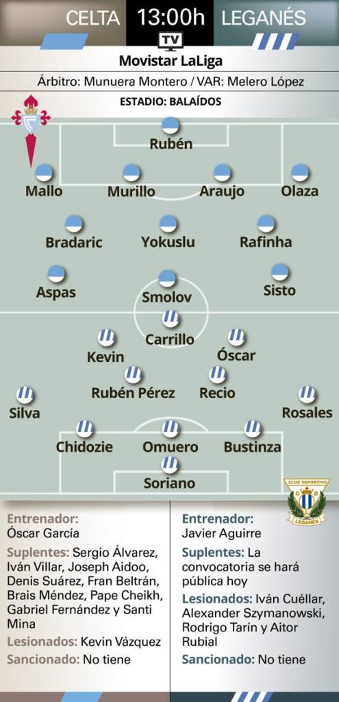 La dupla Araujo-Murillo se ha convertido en una de las piezas claves en el resurgir celeste, al igual que el gran momento de forma de Okay Yokuslu y Rafinha Alcántara. Los cuatro repetirán titularidad. También Aspas y el ruso Smolov en ataque, donde tiene muchas opciones de entrar Pione Sisto.El croata Bradaric, que se estrenó en el once en Madrid, tiene más opciones que Fran Beltrán de repetir en el doble pivote junto a Okay, mientras que el portero Rubén Blanco y el lateral zurdo Lucas Olaza son indiscutibles en sus puestos.