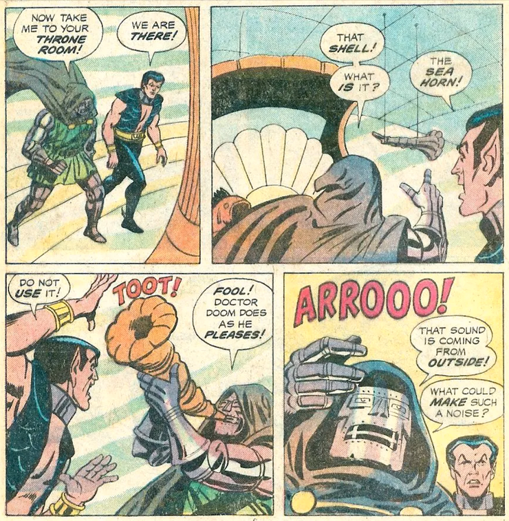 El conjunto de imágenes es simple: el Doctor Doom y Namor the Sub-Mariner viajan a la sala del trono de los atlantes, donde Doom ve un caparazón que cuelga del techo. En el panel más famoso, Namor llora “¡No lo toques!” a lo que el Doctor Doom responde “¡Tonto! ¡El Doctor Doom toca como le plazca!” Posteriormente hace sonar el cuerno de mar, acompañado de un humorístico ¡SONAR! efecto de sonido. Desafortunadamente, el diálogo anterior es una edición de fan del panel real (en la foto de abajo), pero no está muy lejos de la verdad.