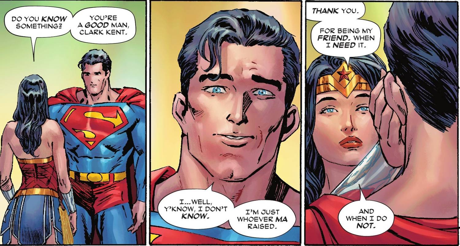En Mujer Maravilla #7 de Tom King y Guillem March, Diana y Superman se encuentran en un breve desacuerdo por su negativa a aceptar la ayuda de Clark en el actual procesamiento mundial de las Amazonas.