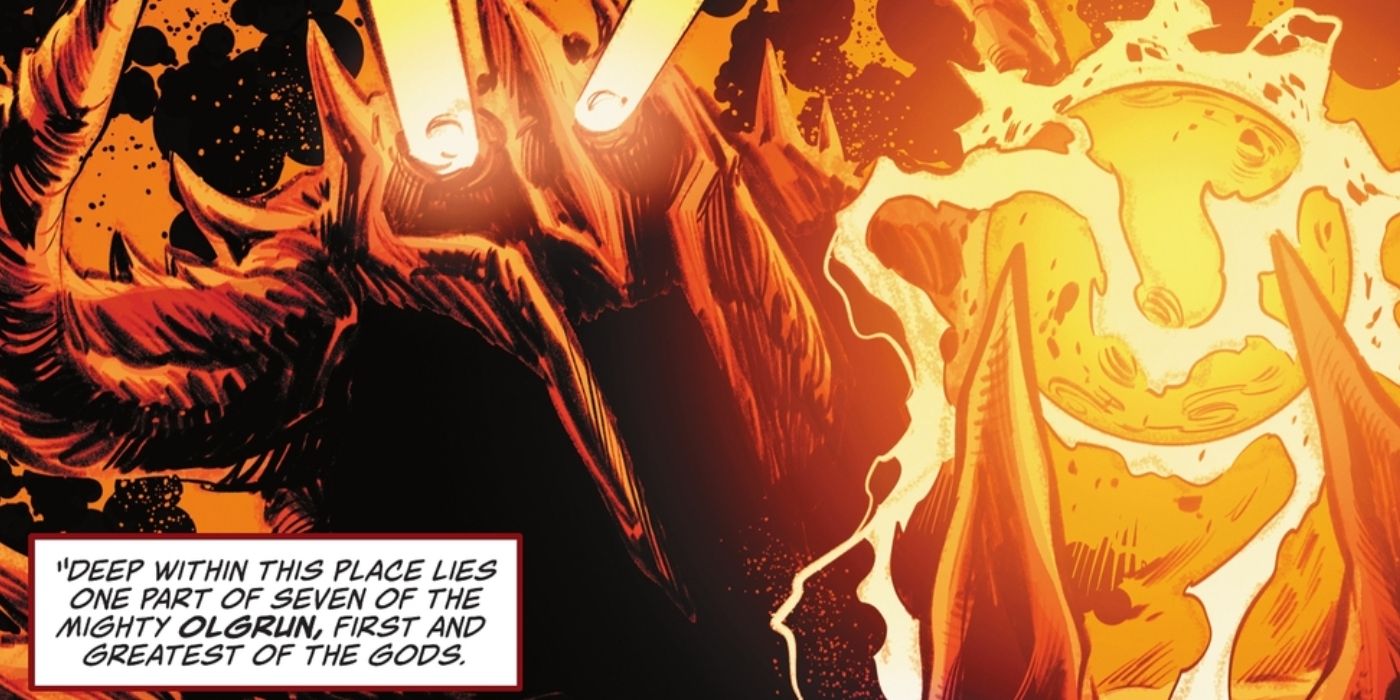 La historia de fondo de Olgrun se exploró por primera vez durante la “Saga Warworld” de Cómics de acción. Olgrun era un poderoso dios antiguo que era considerado uno de los seres más grandes, al menos antes de volverse loco. Olgrun fue derrotado por otros Dioses Antiguos y su esencia se dividió en varios aspectos que se esparcieron por el multiverso. Sin embargo, Superman recuperó uno de estos aspectos y lo utilizó para revivir a su hijo adoptivo Osul-Ra. Metron de los Nuevos Dioses expresó más tarde su temor de que Superman puede haber despertado potencialmente a Olgrun.