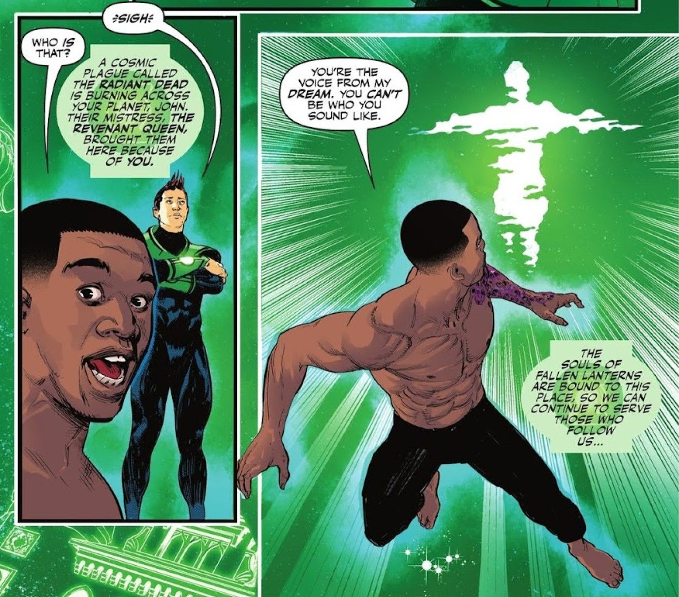 “/> En este número, la batalla de John con Varron corrompe sus poderes, y ahora está a punto de convertirse en uno de los Radiant Dead: una versión retorcida y no muerta del Green Lantern Corps. Mientras muere lentamente, comienza a escuchar una voz siniestra en su cabeza que solo puede describirse a sí mismo como una “voz familiar.” Dada la familiaridad del estilo de letras para este “voz“, los lectores saben que esta es la misma voz omnipotente con la que hablaba Lantern Shepherd en el primer número: Kyle Rayner de otro universo. En el universo principal, por supuesto, Kyle sirvió como el único Linterna Verde de la Tierra durante gran parte de la década de 1990, cuando no estaba trabajando como artista en su vida civil.