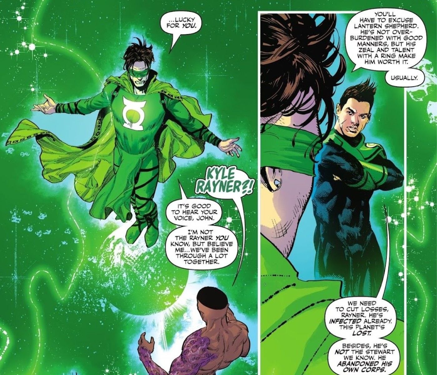“/> Esta versión de Kyle está vestida completamente de verde de la cabeza a los pies, incluidos pantalones harén verdes, una venda verde que cubre completamente sus ojos y una capa verde que recuerda al Linterna Verde original, Alan Scott. Kyle le dice a John, “No soy el Rayner que conoces, pero créeme… hemos pasado por muchas cosas juntos”. lo que parece sugerir que, al igual que Lantern Shepherd, este Kyle Rayner puede ser de un universo diferente.