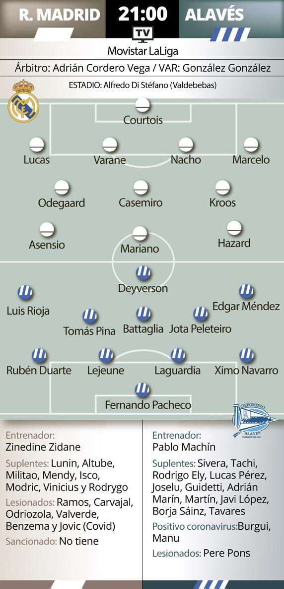 El Alavés, por su parte, aterriza en Valdebebas apremiado por su delicada situación clasificatoria pero con la confianza alta porque suma cuatro partidos sin conocer la derrota. Machín no podrá contar con Burgui ni Manu García al estar aislados por coronavirus pero recupera a Édgar, que vuelve tras su sanción.
