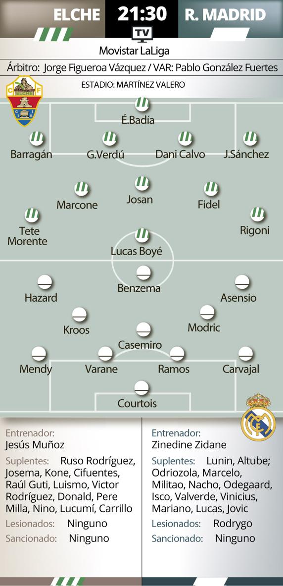 El Elche, por su parte, no podrá contar con Jorge Almirón. El técnico argentino ha dado positivo de nuevo en las pruebas PCR a las que se ha sometido, por lo que no podrá sentarse en el banquillo en el partido ante el Real Madrid.