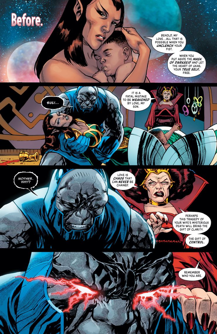 En el Universo DC, Darkseid ha conquistado innumerables mundos y esclavizado a un número incalculable. Durante siglos, ha buscado acabar con el libre albedrío en el universo, poniéndolo todo bajo su control. Se vuelve difícil recordar que una vez fue mortal, con sus propios miedos y necesidades, incluida la compañía. Los fanáticos de Darkseid desde hace mucho tiempo sabrán que Suli era la única mujer que Darkseid realmente amaba; fue asesinada como parte de una conspiración entre Desad y la madre de Darkseid, Heggra, en un complot para endurecer el corazón de Darkseid. Funcionó demasiado bien; la rabia que sintió Darkseid es parte de lo que lo impulsó entonces y, en esta vista previa, los lectores descubren que todavía lo motiva hoy. Por supuesto, como señala su hijo Orion, eso no lo convierte en un héroe.