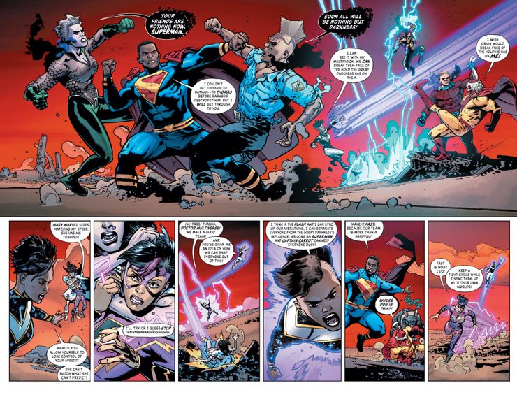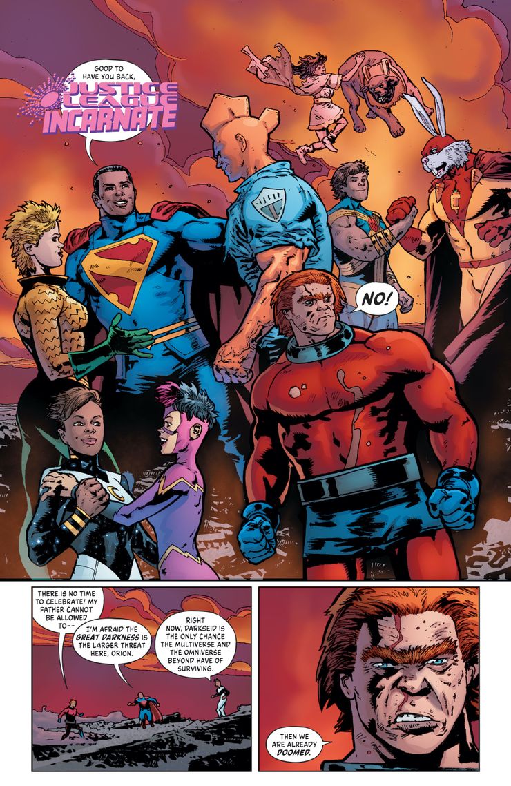 El nombre Darkseid inspira miedo y terror en todo el Universo DC y en los albores de Frontera infinita, el villano ascendió a su forma definitiva, primero matando a la Quintaesencia antes de embarcarse en una búsqueda a través del multiverso, en busca de la Gran Oscuridad, que acecha fuera de sus límites. La Liga de la Justicia Encarnada se enfrentó a Darkseid y le propinó al equipo su primera derrota. Creyendo que Darkseid estaba buscando la Gran Oscuridad para sus propios fines, la Liga de la Justicia Encarnada rastreó a Darkseid hasta la Tierra-7, que estaba siendo atacada por la Mano Vacía. Allí, el equipo se enteró de que Darkseid estaba además tratando de detener la Gran Oscuridad. The Empty Hand, un ser inmensamente poderoso de fuera del multiverso, también ha estado detrás de la Gran Oscuridad, y en una impresionante demostración de poder, casi mata a Darkseid. El Señor de Apokolips puede estar caído pero no está fuera, y en una vista previa para Liga de la Justicia Encarnada #5saca fuerza de una fuente sorprendente.