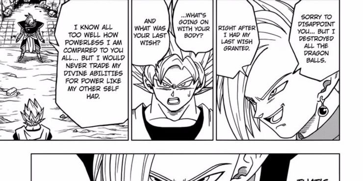 En Dragon Ball Súper Capítulo 20 de Akira Toriyama y Toyotarou, Goku y Vegeta viajan a un futuro alternativo donde un poderoso villano llamado Zamasu ha diezmado el mundo. Zamasu, quien era un Supremo Kai-en-entrenamiento, obtiene el poder necesario para acabar con toda la vida mortal existente al desear que las Super Dragon Balls cambien de cuerpo con Goku y se conviertan en el todopoderoso Goku Black, convirtiéndose efectivamente en un “malvado”. Gokú”. Después de obtener todo lo que necesita de la magia de las Super Dragon Balls, destruye los artefactos mágicos. De esta manera, nadie puede usar su poder para detenerlo en su oscura misión de eliminar a todos los mortales en todos los universos conocidos, ya que él cree que limpiar los universos de la vida es la única forma de salvar verdaderamente toda la existencia.