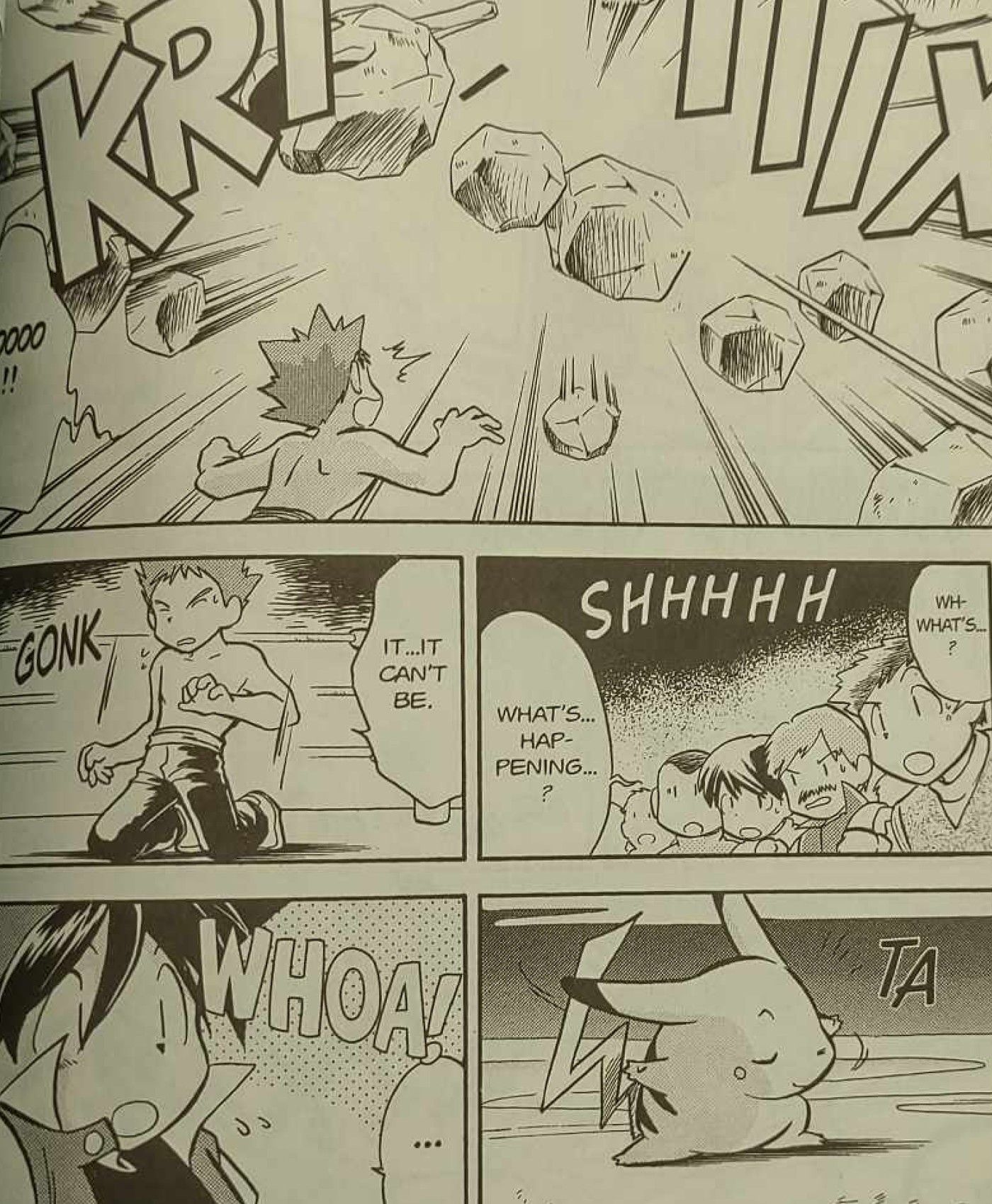 - El manga muestra una batalla de gimnasio poco convencional, donde la fuerza de voluntad de Pikachu le permite destrozar el cuerpo de Onix, demostrando su fuerza en comparación con el Pikachu de Ash en el mismo punto de sus viajes.
