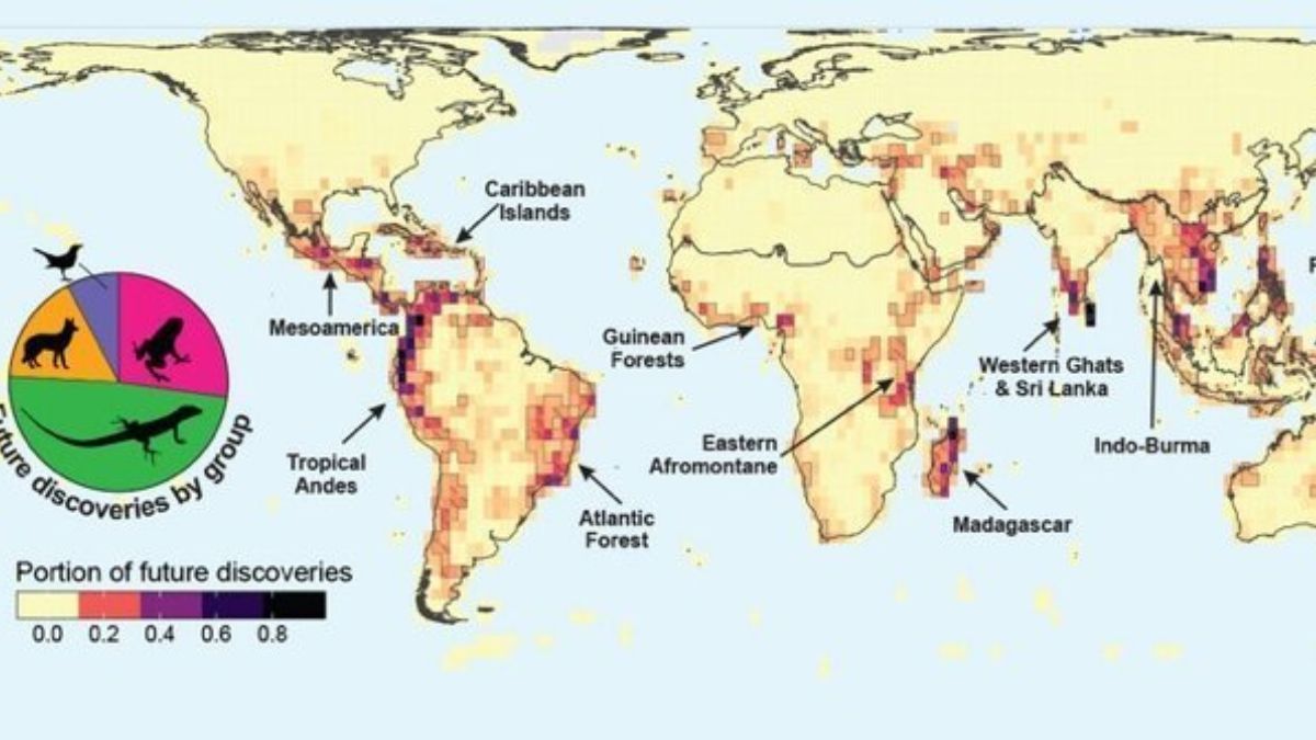 Para abordar esta “escasez de biodiversidad”, los ecologistas Mario Moura y Walter Jetz crearon un modelo de mapa extrapolando dónde podrían existir especies desconocidas de vertebrados terrestres hoy, basándose en factores biológicos, ambientales y sociológicos asociados con los más de 32.000 vertebrados terrestres ya conocidos por los biólogos.
