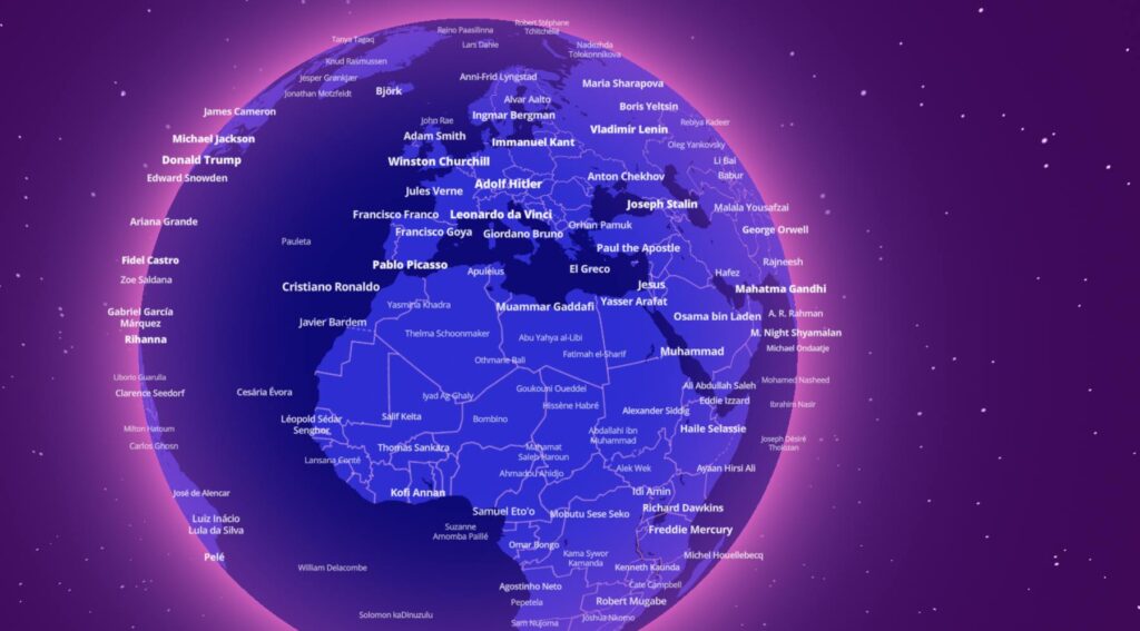 Gracias a estos datos, además de los de Wikidata ha desarrollado un mapa mundial en el que podemos encontrar los personajes más célebres de cada lugar. Pero no solo podemos ver el ganador absoluto de esta competición por ser el más buscado o conocido de la historia, sino que también se puede aplicar un filtro específico.