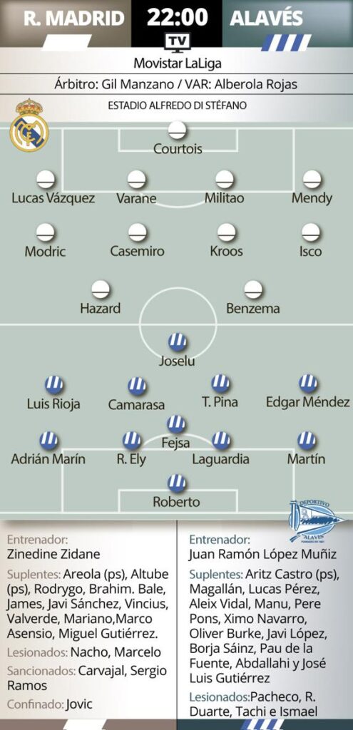 Más para elegir tendrá Zidane en el centro del campo y en ataque en un partido en el que podría regresar Hazard a la titularidad tras perderse los últimos tres partidos. No estará al cien por cien. Se peleará por un puesto con un Vinicius que no pudo entrenar ayer por un falso positivo de coronavirus.