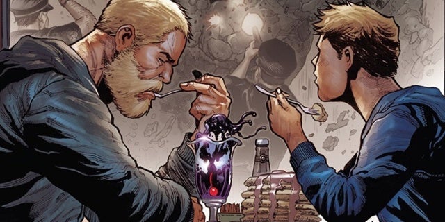 "Después de semanas de correr y luchar contra los monstruos de Asgard en la GUERRA DE LOS REINOS, Eddie Brock finalmente tiene un momento para recuperar el aliento. Pero sin su simbionte, conseguir las necesidades básicas se convertirá en un desafío para Eddie Brock. Lo que significa ¡Que mantener vivo a su hijo, Dylan, también lo estará!