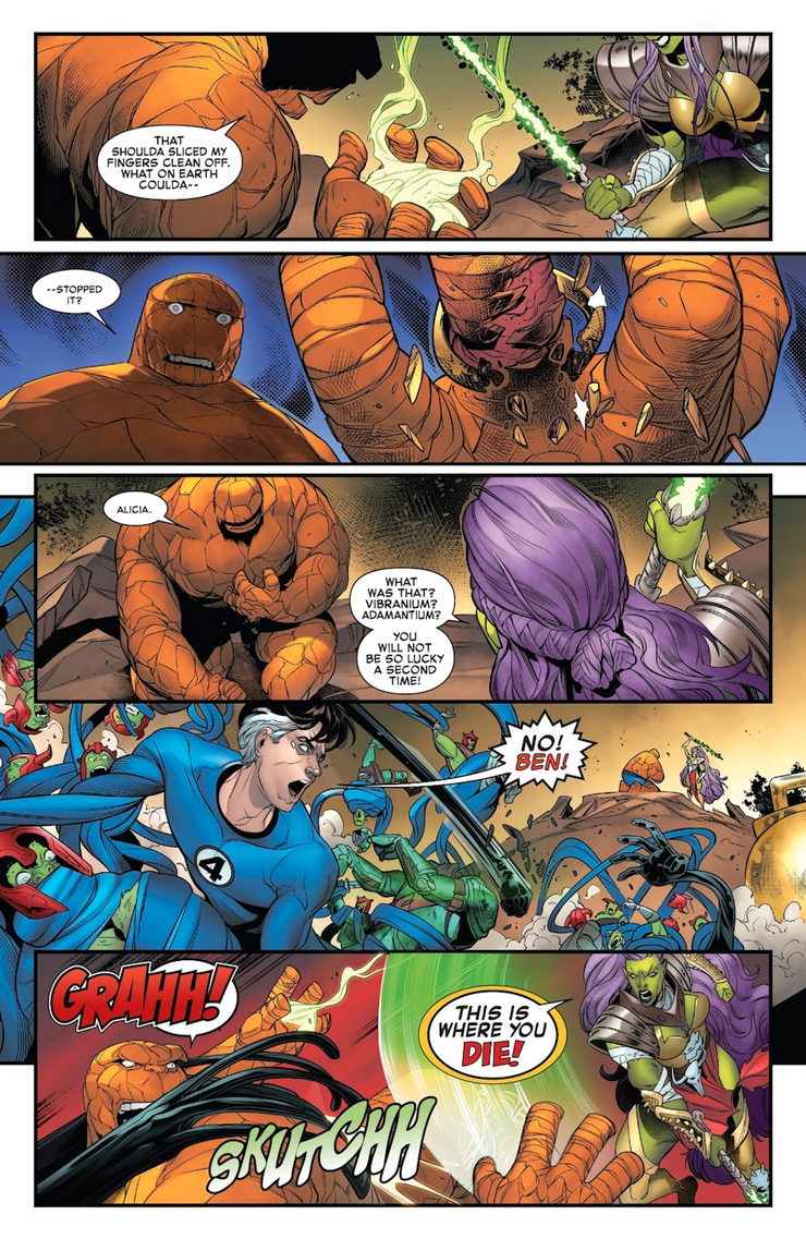 The Thing ve al guerrero Rapture y los dos pelean, pero Rapture puede superar fácilmente el estilo de lucha de The Thing (que consiste principalmente en ataques frontales y no incluye defensa con respecto a los enemigos con espadas). Rapture baja su espada contra la mano extendida de Thing, y aunque partes de su piel rocosa se han desprendido, no está muerto (para su asombro). Se da cuenta de que su anillo de bodas recibió el ataque que estaba destinado a él. “alicia” solo puede decir mientras Rapture ataca por segunda vez; Ben solo se salva gracias a la oportuna intervención de Reed.