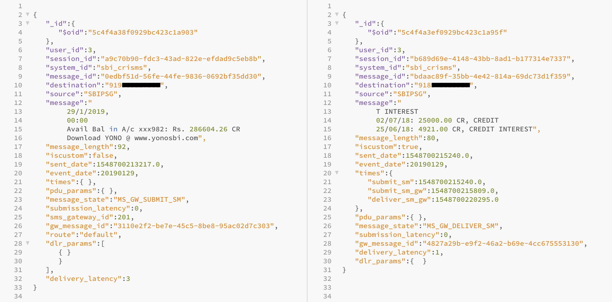 La base de datos sin contraseña nos permitió ver todos los mensajes de texto que se envían a los clientes en tiempo real, incluidos sus números de teléfono, saldos bancarios y transacciones recientes. La base de datos también contenía el número de cuenta bancaria parcial del cliente. Algunos dirían cuándo se había cobrado un cheque, y muchos de los mensajes enviados por el banco incluían un enlace para descargar la aplicación YONO de SBI para la banca por Internet.