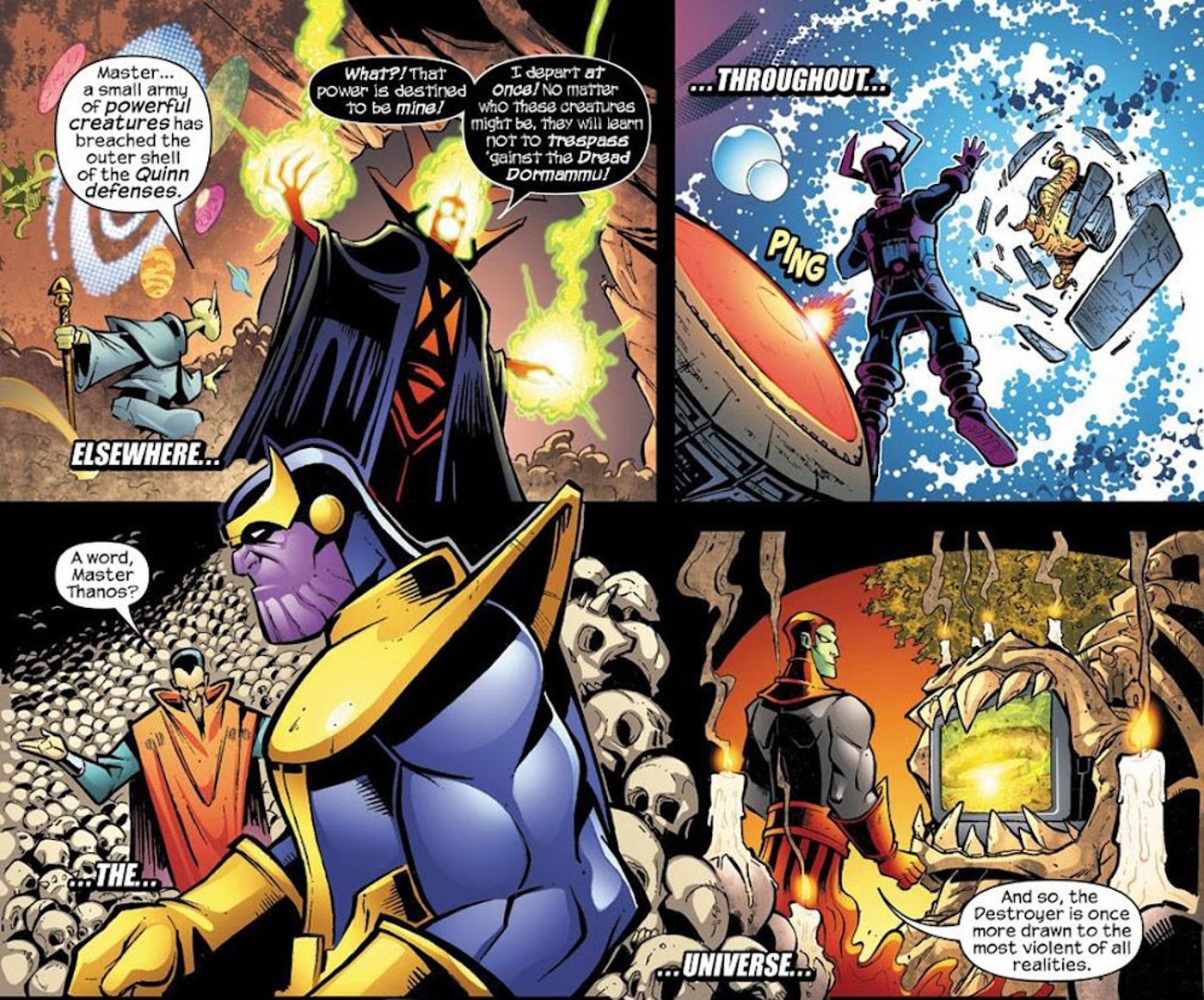 En Doctor Doom y los Maestros del Mal #3 – del escritor Paul Tobin, los artistas Patrick Scherberger y Esdras Cristobal, y el rotulador Dave Sharpe – Doctor Doom y su grupo de autores intelectuales están a la caza de Quinn, quien conoce los caminos que recorrieron las Infinity Stones. Incluso los caminos de las piedras producen una magia tan poderosa que él mismo se encuentra en una prisión autoimpuesta, con la ayuda de los Vigilantes.