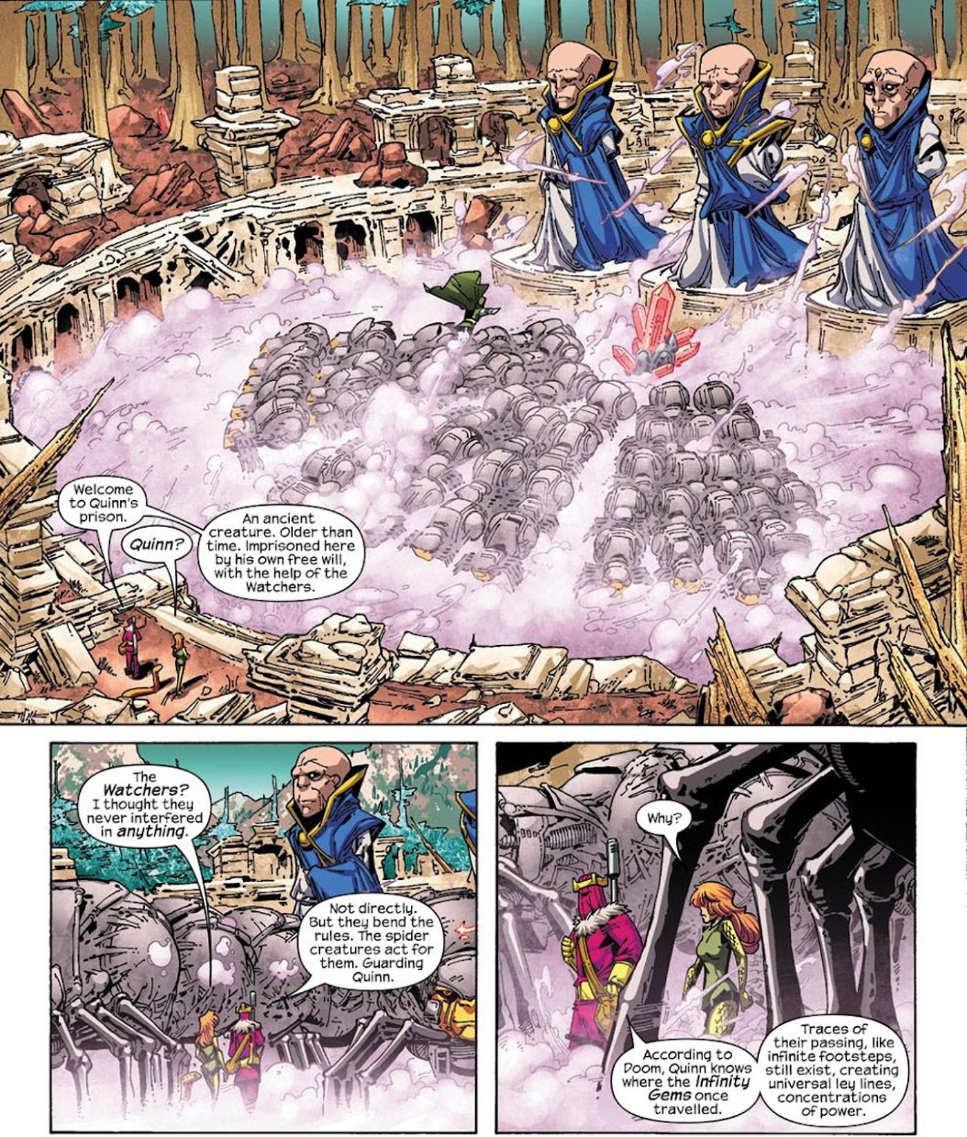 Las Piedras del Infinito son los artefactos más codiciados del mundo. Universo Marvel, siendo suficiente una fracción de su magia para reescribir la realidad. Sólo un ser guarda los verdaderos secretos detrás de las piedras, y doctor fatalidad buscó llevárselos. AUna entidad conocida sólo como “Quinn” es la clave de las Gemas del Infinito.y su conocimiento se mantiene a salvo incluso para aquellos que buscan tomar el poder.